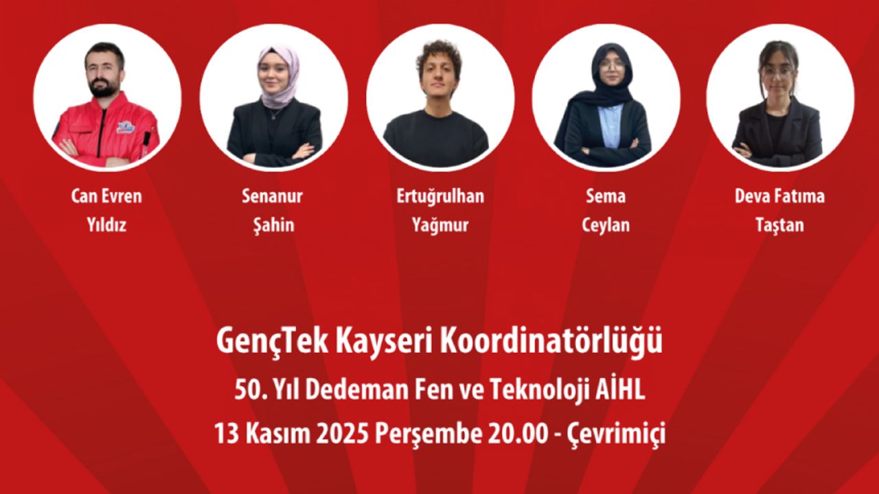 Gençtek Kayseri 50. Yıl Dedeman Fen ve Teknoloji AİHL ekibi olarak sizleri, Teknofest deneyimlerimizi aktaracağımız, sorularınıza cevaplar bulabileceğiniz özel bir programa davet ediyoruz
