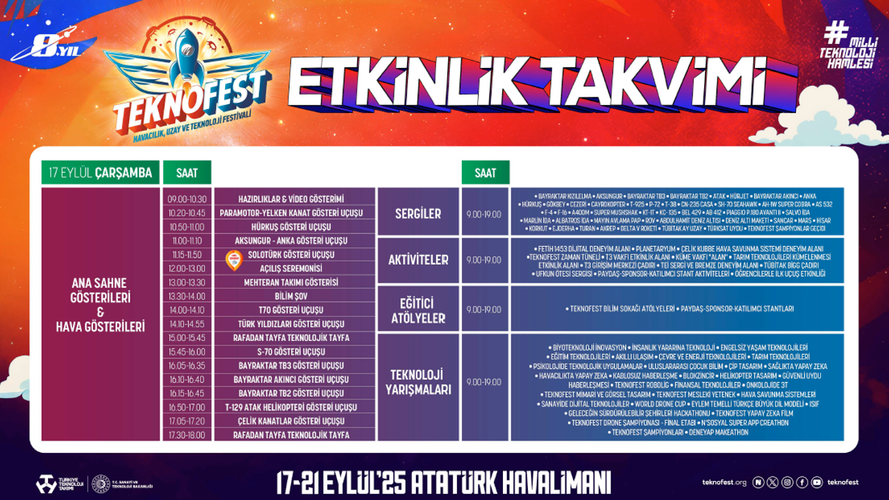 Beş gün sürecek festival süresince gözümüz hep yükseklerde olacak! Yerli ve milli gururumuz olan hava araçlarımız TEKNOFEST semalarını süsleyecek. Halka açık uçuşlarını sergileyecek olan Bayraktar TB2 ve Anka, Türk Yıldızları, Solotürk, Hürkuş, Akıncı, Atak, Hürjet ve daha nicesi eşlik edecek. Gösterileri heyecan ve gururla izleyen öğrenciler, ilk uçuş deneyimlerini yaşayacak!