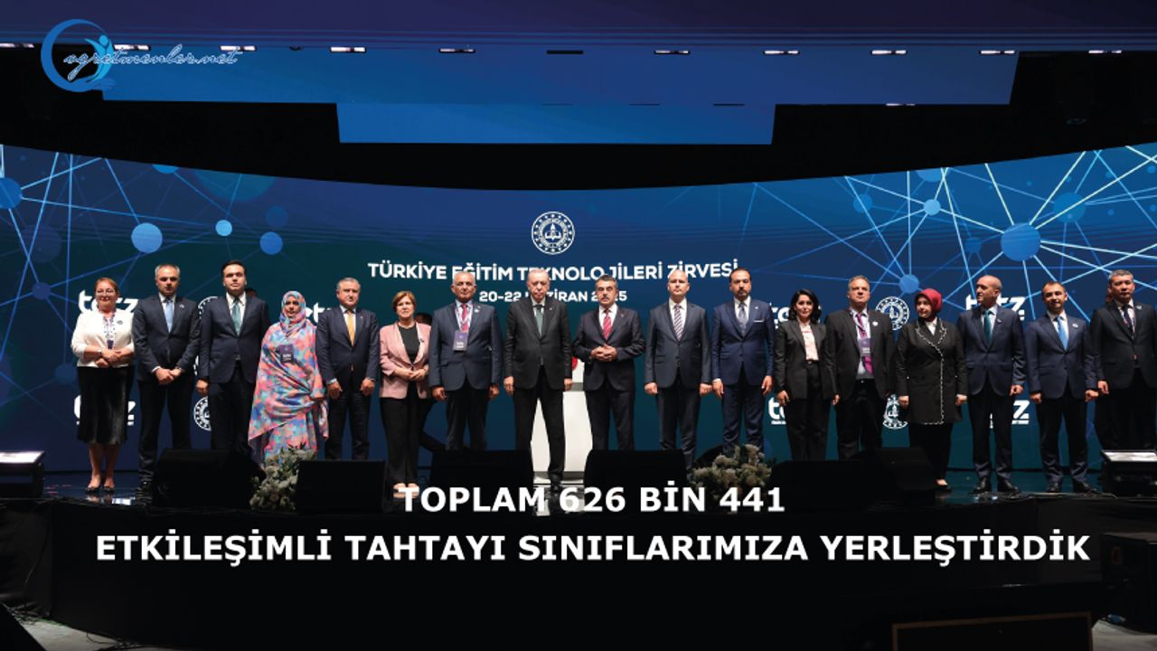 Erdoğan, böylelikle tüm okullara etkin şekilde internet hizmeti kurduklarına dikkati çekerek, "Öğrencilerimizin modern, katılımcı ve zengin bir öğrenme ortamından istifade edebilmesi için 51 bin 758'i son 2 yılda olmak üzere toplam 626 bin 441 etkileşimli tahtayı sınıflarımıza yerleştirdik. Bu sayıyla Türkiye'yi neredeyse tüm dersliklerinde etkileşimli tahta kurulumunu tamamlamış ilk ve tek ülke konumuna getirdik. Öğrencilerimizin bilişim teknolojileri okuryazarlıklarını ve yetkinliklerini geliştirmek için okullarımızda bilişim teknolojileri sınıfları tesis ettik. Kullanım ömrü sona eren 1980 bilişim teknolojileri sınıfımızı güncelliyoruz." diye konuştu.