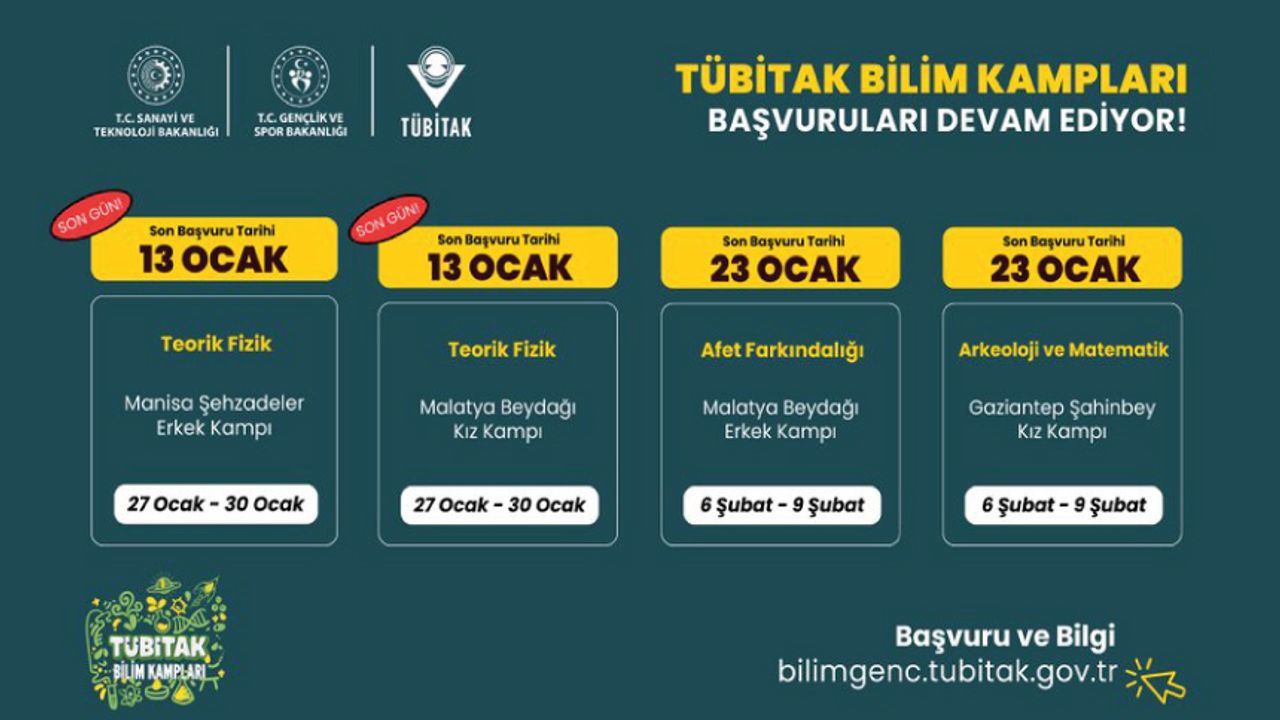TÜBİTAK Bilim Kampları başvuruları devam ediyor! Teorik Fizik, Afet Farkındalığı ile Arkeoloji ve Matematik alanlarında düzenlenecek Bilim Kamplarına başvurular; 13 Ocak ve 23 Ocak tarihlerinde saat 23.59’da sona erecek.