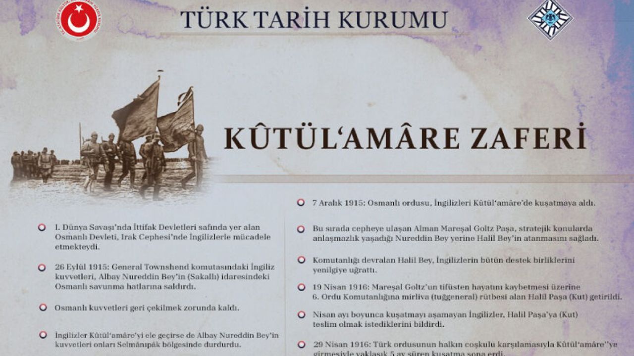 Türk ordusunun Birinci Dünya Savaşı’nda elde ettiği en önemli başarılardan birisi olan Kûtül‘amâre Zaferi’nin 110. yıl dönümünde, vatanı uğruna mücadele eden tüm şehit ve gazilerimizi rahmet ve minnetle anıyoruz.#TarihteBugün #KutülAmare pic.twitter.com/wLrQk8DJWZ