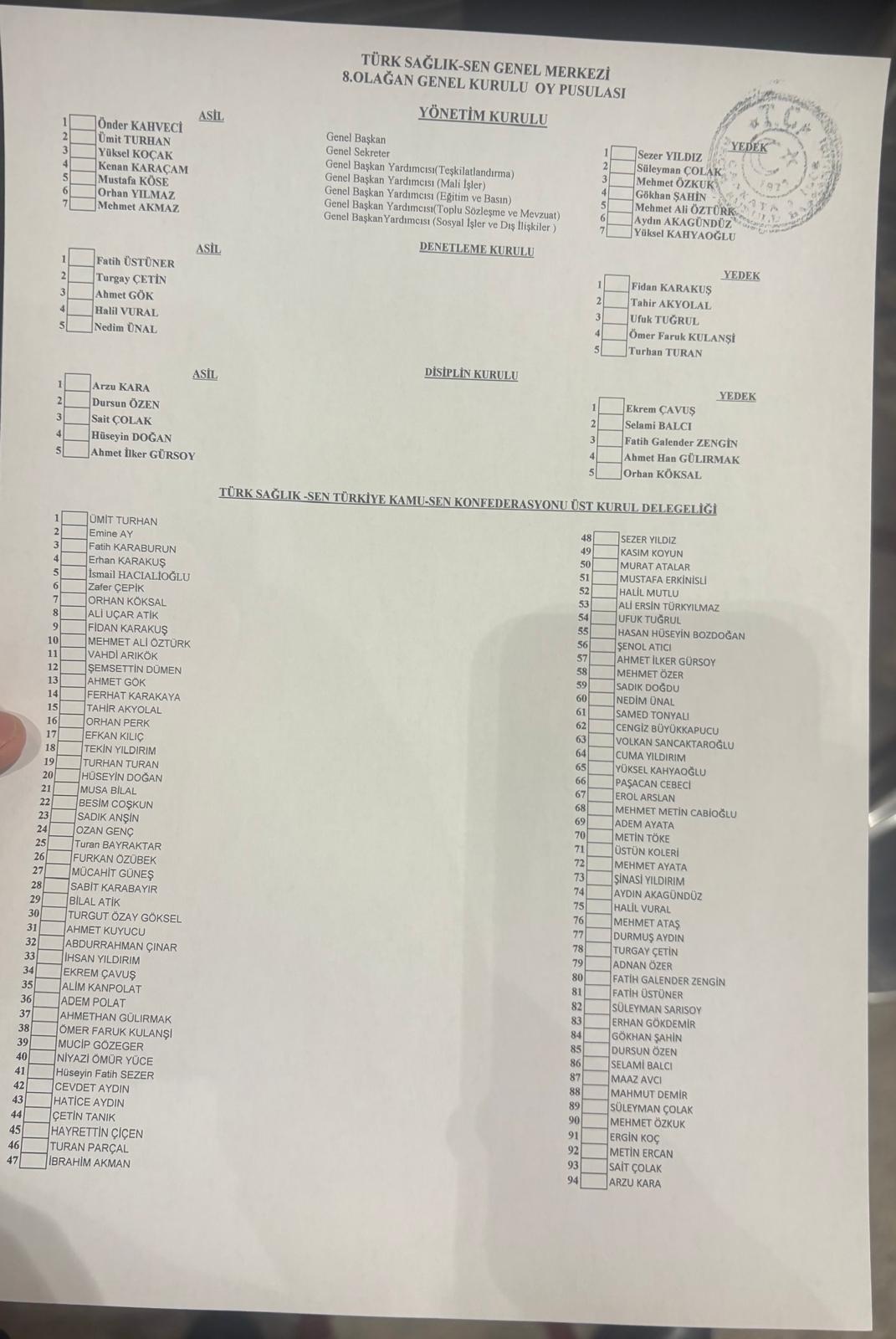 Seçimler sonucunda Türk Sağlık-Sen Genel Merkez yönetim kurulu şu isimlerden oluştu: