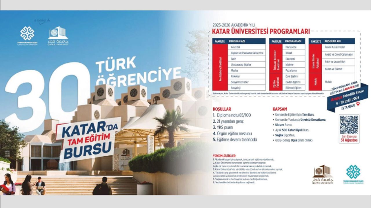 TMV ile Katar Üniversitesi arasında imzalanan anlaşmayla Katar Üniversitesince 30 başarılı Türkiye Cumhuriyeti vatandaşı öğrenciye tam eğitim bursu verilecek. Burs kapsamında yurt dışında lisans eğitimi almak isteyen öğrencilere yurt konaklaması, 3 öğün yemek, sağlık sigortası, yılda bir kez gidiş dönüş uçak bileti ve aylık 500 Katar riyali eğitim desteği sağlanacak. Eğitim dili Arapça olan bölümlerde geçerli olacak bursa başvuru yapacak öğrencilerin lise diploma notunun en az 85 puan olması, Yükseköğretim Kurumları Sınavı'na (YKS) girmiş olması, 21 yaşından gün almamış olması, örgün öğretim mezunu olması, en az B1 düzeyinde Arapça bilmesi şartları aranıyor. Son başvuru tarihi 31 Ağustos olan bursa ön kayıt maarifagency.com adresinden yapılabilecek. Ön kayıt sürecini tamamlayan ve gerekli şartları yerine getiren öğrenciler, Katar Üniversitesi tarafından İstanbul’da sözlü ve yazılı sınava alınacak. Sınavdan başarıyla geçen 30 öğrenci 2026 yılı ocak ayında Katar’da eğitimlerine başlayacak.