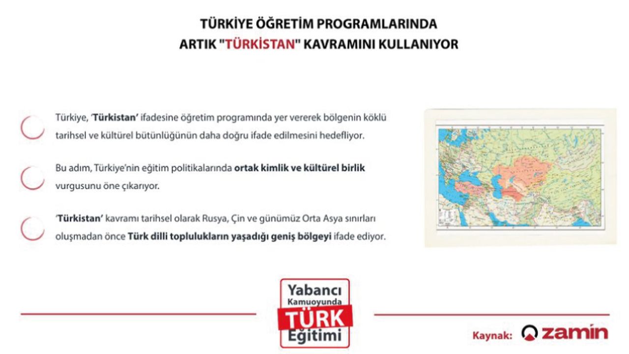 Türkiye Millî Eğitim Müfredatında Köklü Bir Değişiklik Yaptı: Orta Asya Yerine 'Türkistan' Türkiye Cumhuriyeti Millî Eğitim Bakanlığı, 20 Kasım 2025 itibarıyla öğretim programlarında “Orta Asya” ifadesi yerine “Türkistan” ifadesini kullanmaya başladı. Bu değişiklik, Türk basınına Türk Minute tarafından bildirildi. Bakan Yusuf Tekin, bu adımın Türk dünyasında birlik duygusunu güçlendirmeyi amaçladığını ve eğitim sisteminden “emperyal çağrışımlar içeren coğrafi terimlerin” çıkarıldığını vurguladı. Ayrıca haberde, ‘Türkistan’ kavramının tarihsel olarak Rusya, Çin ve günümüz Orta Asya sınırları oluşmadan önce Türk dilli toplulukların yaşadığı geniş bölgeyi ifade ettiği hatırlatıldı. Bu değişiklik, Türkiye’nin son yıllarda eğitim politikalarını kültürel miras, ortak kimlik ve Türk dünyası perspektifi ile uyumlu hâle getirme yönündeki kararlı adımlarından biri olarak değerlendiriliyor. Kaynak: https://zamin.uz/en/world/170564-turkey-introduces-the-term-turkistan-in-schools.html