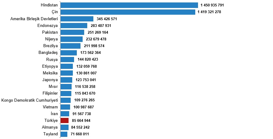 Türkiye, 85 milyon 664 bin 944 kişi nüfusu ile nüfus büyüklüğüne göre 194 ülke arasında 18. sırada yer alırken, dünya toplam nüfusunun %1,0'ını oluşturdu.