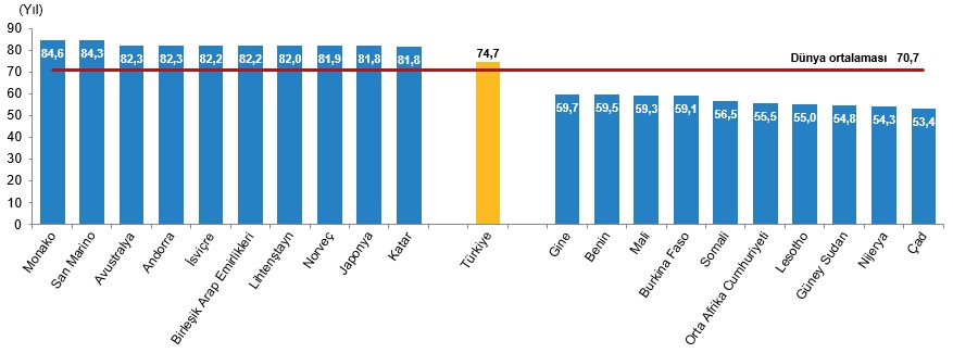 Türkiye'nin erkekler için 74,7 yıl olan doğuşta beklenen yaşam süresinin dünya ortalamasından yüksek olduğu görüldü.
