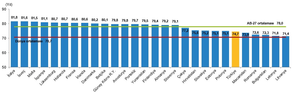 Türkiye'nin erkekler için 74,7 yıl olan doğuşta beklenen yaşam süresinin AB üyesi 27 ülke ortalamasından düşük olduğu görüldü.
