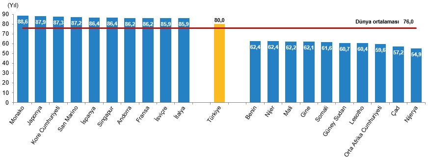 Türkiye'nin kadınlar için 80,0 yıl olan doğuşta beklenen yaşam süresinin dünya ortalamasından yüksek olduğu görüldü.