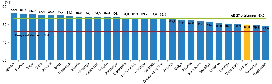 Türkiye'nin kadınlar için 80,0 yıl olan doğuşta beklenen yaşam süresinin AB üyesi 27 ülke ortalamasından düşük olduğu görüldü.