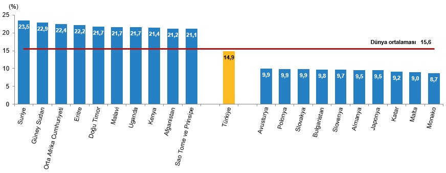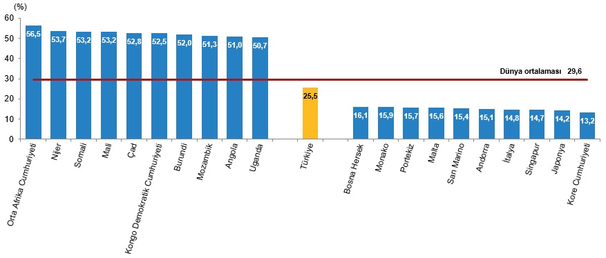 Çocuk nüfus oranı dünya ortalaması, 2024 yılında %29,6 oldu. Türkiye'deki çocuk nüfus oranının %25,5 ile dünya çocuk nüfus ortalamasının altında kaldığı görüldü.