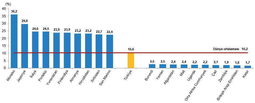 Yaşlı nüfus oranı dünya ortalaması, 2024 yılında %10,2 oldu. Türkiye'nin yaşlı nüfus oranının %10,6 ile dünya yaşlı nüfus ortalamasının hemen üzerinde olduğu görüldü.