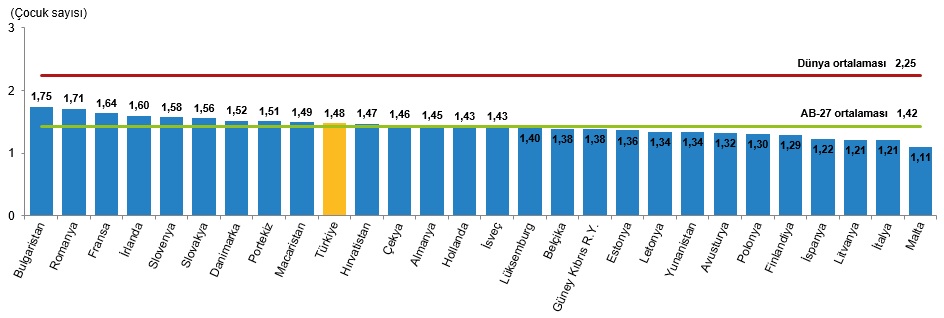 Toplam doğurganlık hızı 2024 yılında 1,48 çocuk olan Türkiye'nin, AB üyesi 27 ülke ortalamasından yüksek olduğu görüldü.