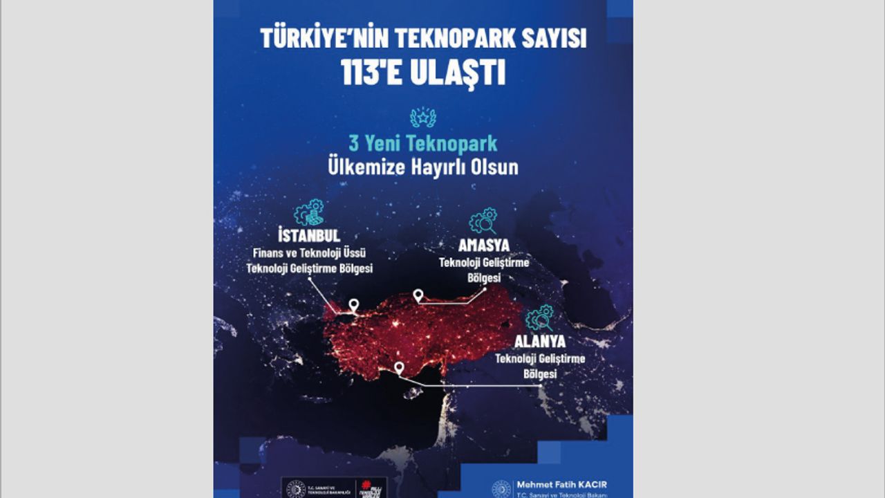 Türkiye’nin girişimcilik ve inovasyon ekosistemi güçlenmeye devam ediyor. Sayın Cumhurbaşkanımızın imzasıyla Resmî Gazetede kuruluş kararı yayımlanan İstanbul Finans ve Teknoloji Üssü Teknoloji Geliştirme Bölgesi Alanya Teknoloji Geliştirme Bölgesi Amasya Teknoloji Geliştirme Bölgesi ile teknoparklarımızın sayısı 113’e ulaştı. Yeni teknoparklarımız teknoloji ve yenilik dünyamıza hayırlı, uğurlu olsun. 12 bine yaklaşan teknoloji girişimi ile ülkemizin inovasyon odaklı kalkınmasına öncülük eden teknoparklarımızı desteklemeyi sürdüreceğiz.