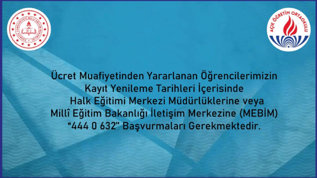 Öğrencilerimizin, Sınavlara girebilmeleri için mezun olana kadar kayıt yenileme işlemlerini Halk Eğitimi Merkezi Müdürlüklerinden veya Millî Eğitim Bakanlığı İletişim Merkezi(MEBİM) "444 0 632" aracılığıyla yaptırmaları gerekmektedir. ( Yeni kayıt işlemleri halk eğitimi merkezi müdürlükleri tarafından yapılmaktadır.)