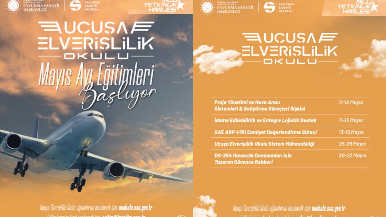 Uçuşa Elverişlilik Okulu Mayıs Ayı Eğitimleri Başlıyor! Havacılık ve savunma sanayii profesyonelleri için özel olarak tasarlanan eğitim programlarıyla sektöre yön vermeye devam ediyoruz! Uçuşa elverişlilik süreçlerine dair kapsamlı bilgiler sunan bu eğitimler, teknik yetkinliklerinizi geliştirmenize ve sektörde fark yaratmanıza olanak tanıyor.