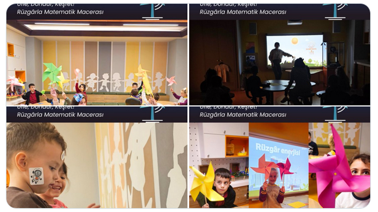 First image shows children in a library room holding colorful paper pinwheels with wind turbine designs on walls and educational logos like TÜBİTAK and cb_kutuphane visible. Second image depicts an instructor presenting wind energy concepts on a screen to seated children in a classroom setting with green field projection. Third image features young children with face stickers examining books or materials related to wind power in a cozy room. Fourth image captures children crafting paper pinwheels using scissors and colored paper near a projected wind energy diagram on a screen.