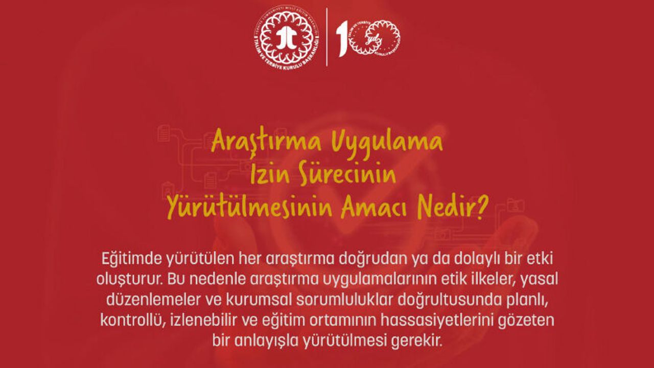Millî Eğitim Bakanlığına bağlı merkez, taşra ve yurt dışı teşkilatlarında yapılacak ulusal ve uluslararası araştırma uygulamaları, belirlenen usul ve esaslar doğrultusunda izin sürecine tabidir.