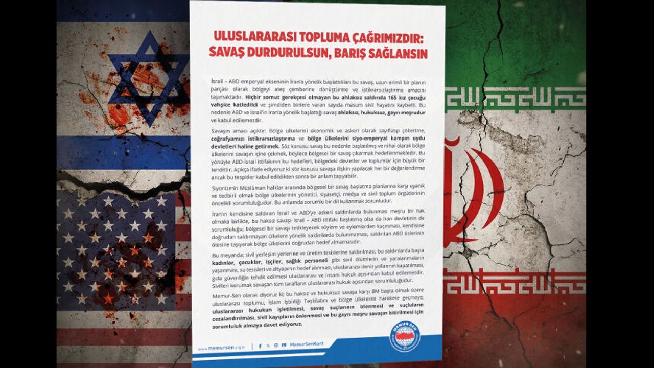 Memur-Sen olarak diyoruz ki; bu haksız ve hukuksuz savaşa karşı BM başta olmak üzere uluslararası toplumu, İslam İşbirliği Teşkilatını ve bölge ülkelerini harekete geçmeye; uluslararası hukukun işletilmesi, savaş suçlarının izlenmesi ve suçluların cezalandırılması, sivil kayıpların önlenmesi ve bu gayrı meşru savaşın bitirilmesi için sorumluluk almaya davet ediyoruz.