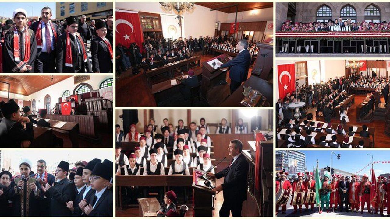 Döneme özgü kıyafetlerle tarihî Birinci Mecliste bir araya gelen öğrenciler, Bakan Tekin ile dualar eşliğinde temsili olarak Birinci Büyük Millet Meclisinin açılış kurdelesini kesti.