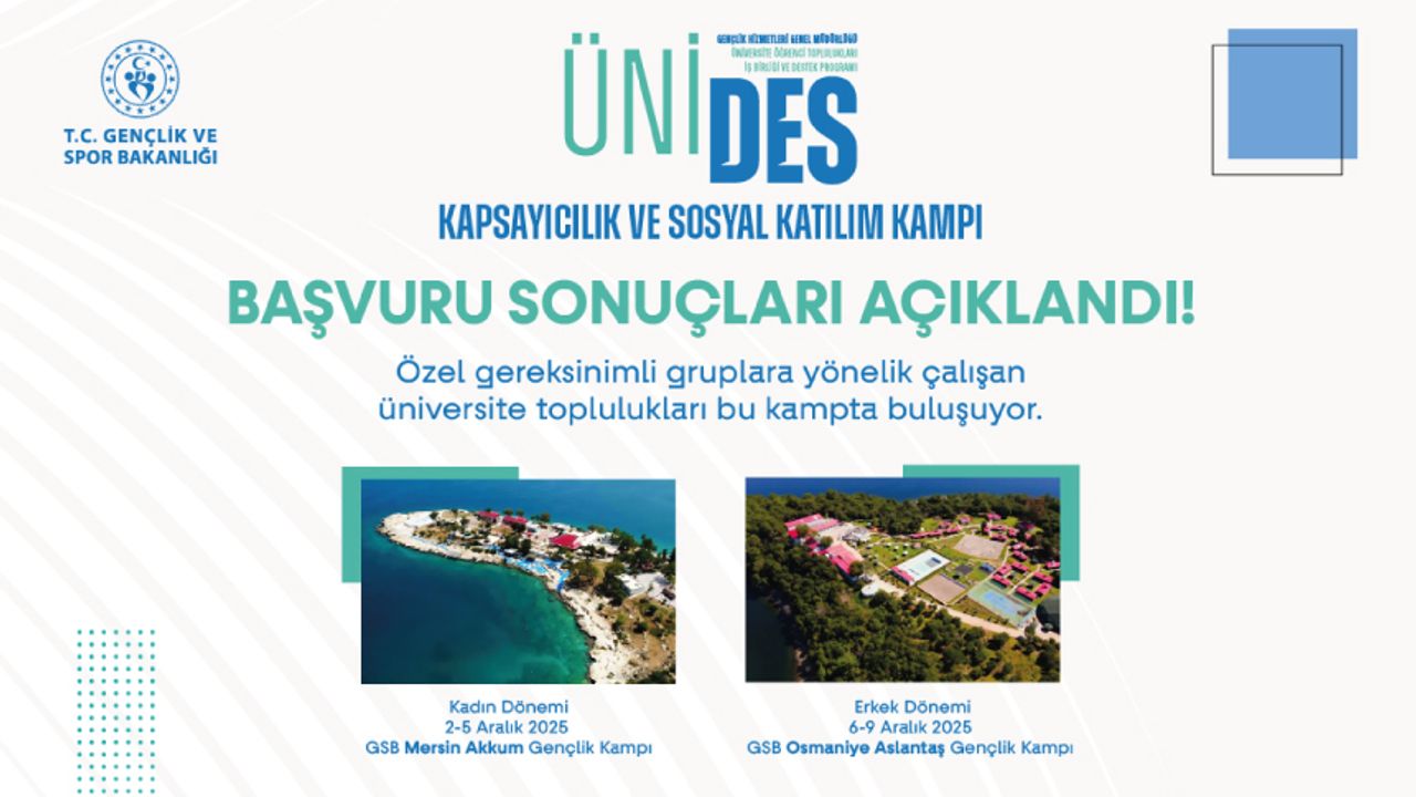 Gençlik Hizmetleri Genel Müdürlüğü tarafından yürütülen Üniversite Öğrenci Toplulukları İş Birliği ve Destek Programı (ÜNİDES) kapsamında, engelli bireylere yönelik faaliyetler yürüten üniversite öğrenci topluluklarına yönelik düzenlenecek “ÜNİDES Kapsayıcılık ve Sosyal Katılım Kampı” için başvuru değerlendirme süreci tamamlandı.