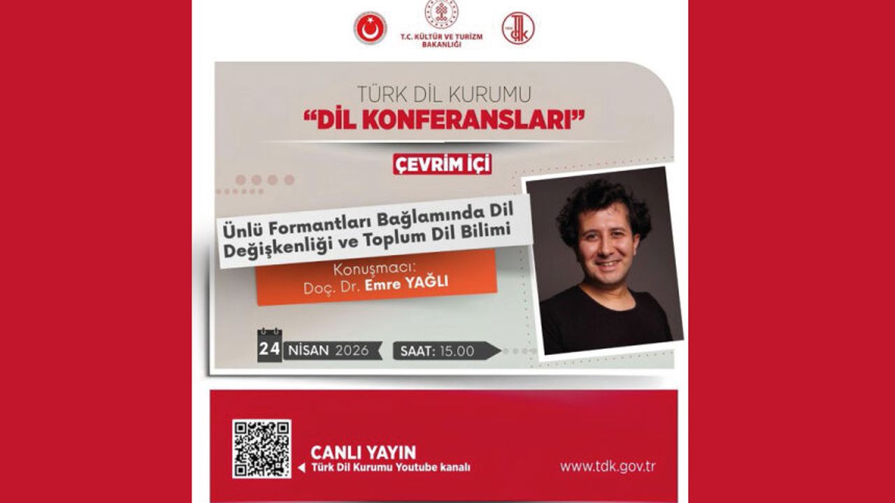 “Çevrim İçi Dil Konferansları” Ünlü Formantları Bağlamında Dil Değişkenliği ve Toplum Dil Bilimi Doç. Dr. Emre YAĞLI 24.04.2026 15.00 Youtube kanalımızdan canlı olarak takip edebilirsiniz. #DilKonferansları