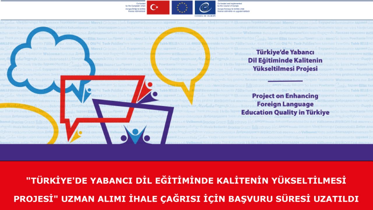 Talim ve Terbiye Kurulu Başkanlığının nihai faydalanıcısı olduğu, Avrupa Birliği ve Avrupa Konseyi tarafından finanse edilen ve Avrupa Konseyi tarafından yürütülen "Türkiye'de Yabancı Dil Eğitiminde Kalitenin Yükseltilmesi Projesi" kapsamında İngilizce dört dil becerisi testlerinin geliştirilmesi ve uygulanması süreçlerinde görev almak üzere yabancı dil testlerine ilişkin ölçme, değerlendirme ve teknik hizmetlerin sağlanmasına yönelik uzman alımı için ihale çağrısı başvuru süresi uzatılmıştır.