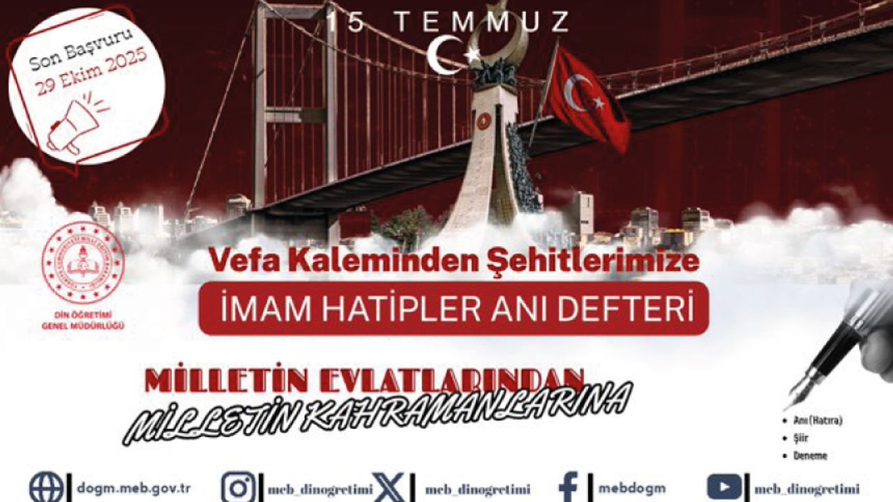 Anadolu imam hatip liselerimiz tarafından oluşturulacak "Vefa Kaleminden Şehitlerimize: İmam Hatipler Anı Defteri" ile öğrencilerimizin kaleminden dökülen anı, şiir ve denemeler bir vefa nişanesi olarak aziz şehitlerimizin ailelerine ulaştırılacak.