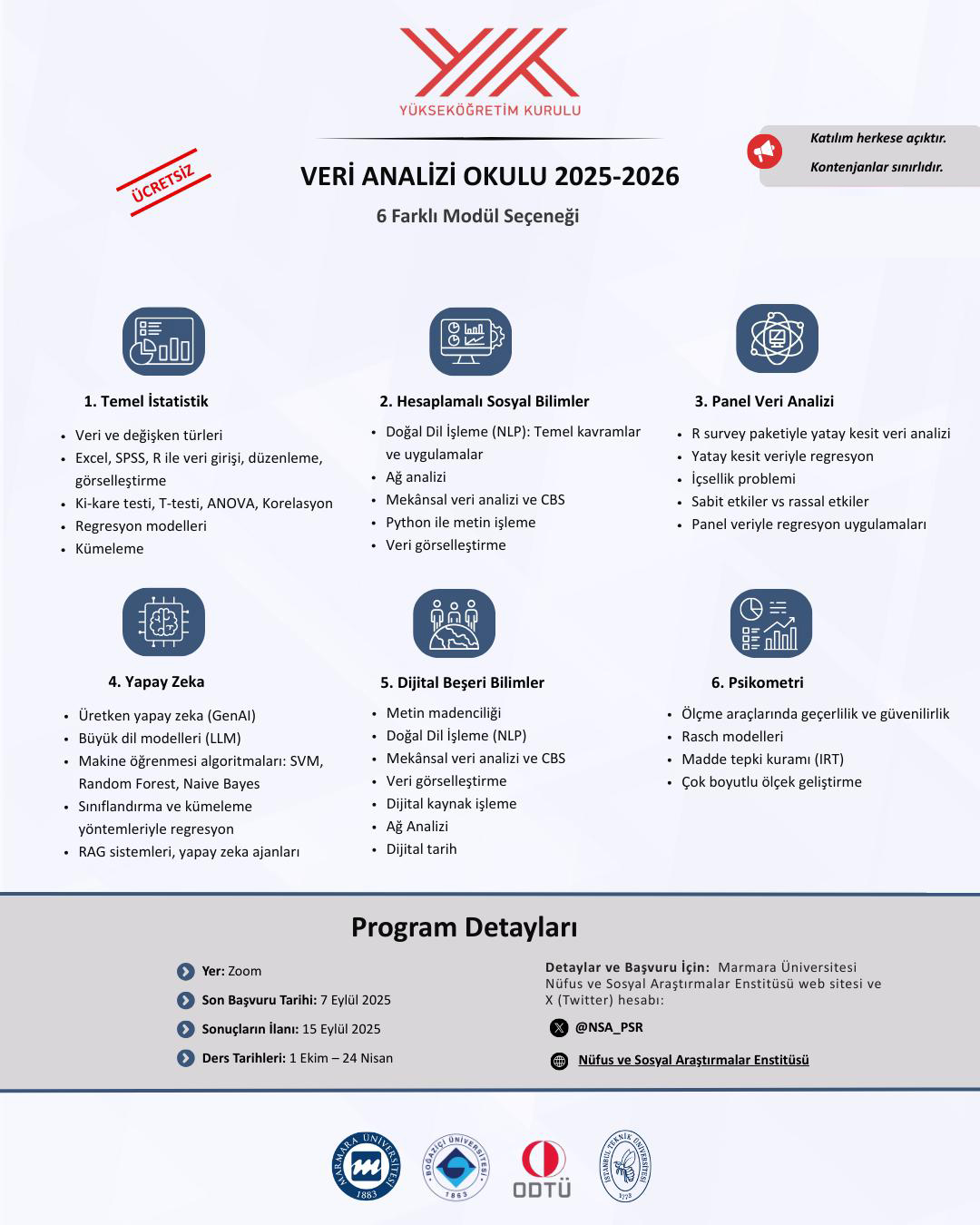 Veri Analizi Okulu, 1 Ekim 2025’te başlayacak ve 24 Nisan 2026’ya kadar sürecek. Eğitimler çevrim içi gerçekleştirilecek ve Temel İstatistik, Panel Veri Analizi, Psikometri, Hesaplamalı Sosyal Bilimler, Dijital Beşerî Bilimler, Yapay Zekâ olmak üzere altı ayrı modülden oluşacak.