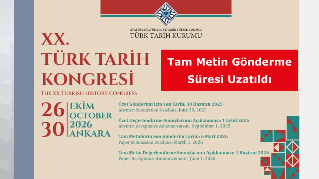 26-30 Ekim 2026 tarihlerinde düzenlenecek XX. Türk Tarih Kongresi’ne tam metin son gönderim tarihi 6 Mart 2026’ya kadar uzatılmıştır.