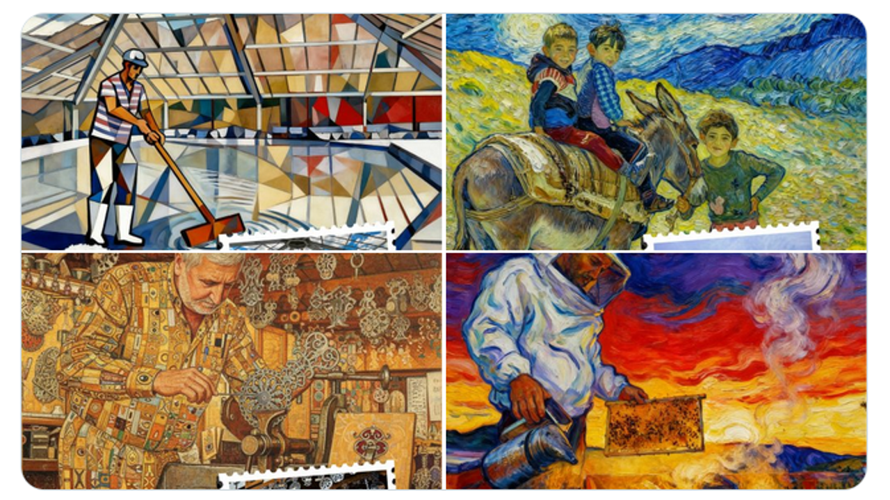 First image shows a worker in striped shirt and cap mopping a floor covered in salt piles inside a large glass-domed structure with colorful geometric panels and blue sky visible through, styled in Pablo Picassos cubist manner, with a stamp of a similar scene and text Pablo Picasso. Second image depicts two young boys in colorful clothes riding a donkey on a yellow field under a swirling starry blue night sky with mountains, in Vincent van Goghs post-impressionist style, including a stamp of a landscape with riders and text Van Gogh. Third image portrays an elderly man in yellow patterned suit crafting intricate lace jewelry at a workbench surrounded by hanging designs in a ornate room, in Gustav Klimts art nouveau style, with a stamp showing the craftsman and text Gustav Klimt. Fourth image illustrates a beekeeper in white suit holding a smoker near honeycomb boxes at sunset with red sky and mountains, in Edvard Munchs expressionist style, featuring a stamp of the beekeeper scene and text Edvard Munch. All images have Kultur label.