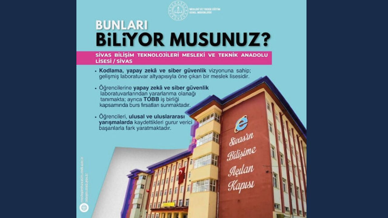 Sevgili Gençler, Sivas Bilişim Teknolojileri Mesleki ve Teknik Anadolu Lisesi; yapay zekâ ve siber güvenlik alanına yönelik güçlü altyapısı ve gelişmiş laboratuvarlarıyla geleceğin mesleklerini bugünden şekillendiriyor. Teknoloji dolu bu yolculukta daima yanınızdayız. #MeslekiVeTeknikEğitim #SivasBTMTAL #BilişimTeknolojileri #YapayZekâ #SiberGüvenlik #TeknolojiEğitimi #GeleceğinMeslekleri