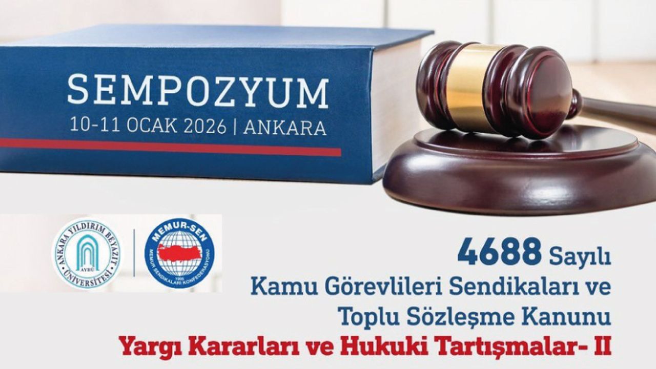 4688 Sayılı Kamu Görevlileri Sendikaları ve Toplu Sözleşme Kanunu "Yargı Kararları ve Hukuki Tartışmalar-II" Sempozyumumuz başlıyor Adalet Bakanı Sn.Yılmaz Tunç’un açılışını gerçekleştireceği, Memur-Sen ve Ankara Yıldırım Beyazıt Üniversitesi ortaklığıyla bu yıl ikincisini düzenlediğimiz “Yargı Kararları ve Hukuki Tartışmalar-II” sempozyumumuz; yargı mensupları, akademisyenler, sendikacılar ve hukukçuların katılımıyla gerçekleşecek. Kızılcahamam Çam Otel 10 Ocak 2026 09.30