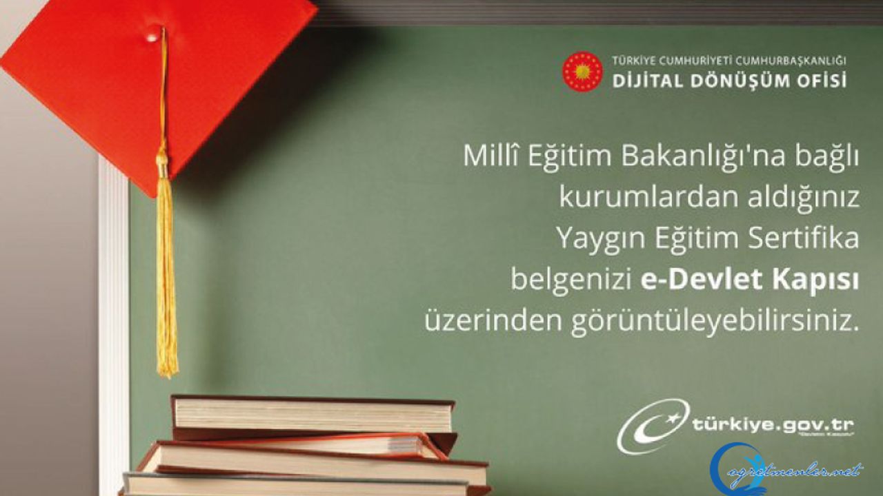 Millî Eğitim Bakanlığı'na bağlı kurumlardan aldığınız Yaygın Eğitim Sertifika belgenizi e-Devlet Kapısı üzerinden görüntüleyebilir, Yaygın Eğitim Bilgi Sistemi'ne erişebilirsiniz.