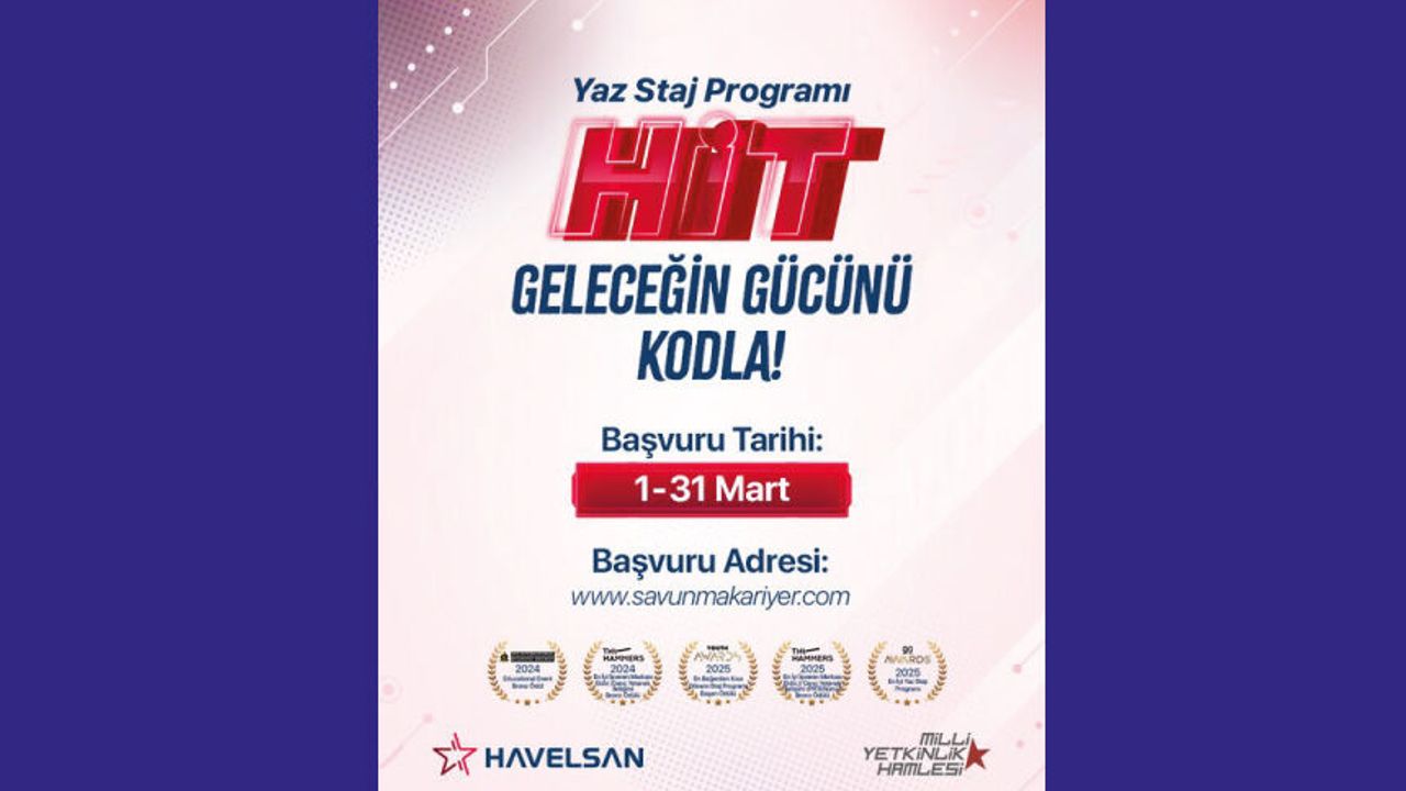 Yaz Staj Programı HİT: "Geleceğin Gücünü Kodla" ile kariyerine güçlü bir başlangıç yap! Genç yetenekler için hayallerin gerçek olabileceği Yaz Staj Programı başvuruları başladı. Son başvuru tarihi 31 Mart 2026. Başvuru için; https://savunmakariyer.com/ilanlar/ilanDetay/699c569ec06bde27edc71bca