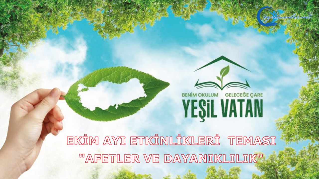 Yeşil Vatan - Benim Okulum Geleceğe Çare Ekim Ayı Etkinlikleri başladı! Ekim ayı teması: "Afetler ve Dayanıklılık" Bu kapsamda hazırlanan; Afetler ve ilk yardım konulu eğitim materyalleri ve dijital içeriklere, Güncellenen Yeşil Vatan Tematik Takvimi Uygulama ve Yönetim Rehberi’ne, İlkokul ve ortaokul öğrencilerimiz için hazırladığımız Çevre ve İklim Okuryazarlığı Etkinlikleri