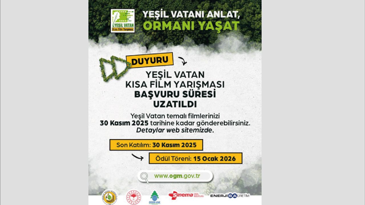 Yeşil Vatan Kısa Film Yarışması Başvuru Süresi Uzatıldı. Milli Eğitim Bakanlığı tarafından Kasım ayının Orman Ayı olarak ilan edilmesi ve 11 Kasım Milli Ağaçlandırma Günü’nün de yarışma eserlerinde yer alabilmesi için son başvuru tarihi 30 Kasım 2025’e kadar uzatıldı. Detaylı bilgi için; https://ogm.gov.tr/tr/duyurular/yesil-vatan-kisa-film-yarismasi-basvuru-suresi-uzatilmistir