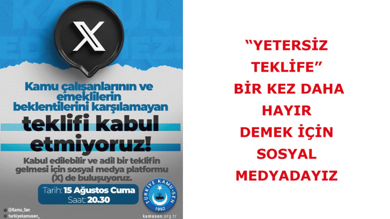 Bu akşam saat 20.30’da Sosyal medya platformu (X) üzerinden “Yetersiz Teklife” bir kez daha HAYIR diyor, sosyal medyada gündemi belirliyoruz!