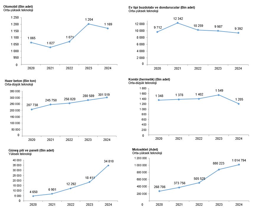 Ülkemizde 2024 yılında 1 milyon 169 bin 17 adet otomobil, 9 milyon 392 bin 251 adet ev tipi buzdolabı ve dondurucu, 301 milyon 519 bin 254 ton hazır beton, 1 milyon 204 bin 576 adet kombi (hermetik), 34 milyon 810 bin 425 adet güneş pili ve paneli ve 1 milyon 14 bin 794 adet motosiklet üretildi.