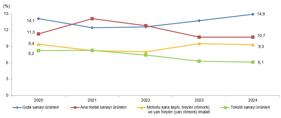 Girişimlerin 2024 yılında ürettikleri ürünlerden yapılan satış değerinin %14,9'unu gıda sanayi ürünleri oluşturdu. Bunu %10,7 ile ana metal sanayi ürünleri, %9,3 ile motorlu kara taşıtı, treyler (römork) ve yarı treyler (yarı römork) imalatı ve %6,1 ile tekstil sanayi ürünleri takip etti.