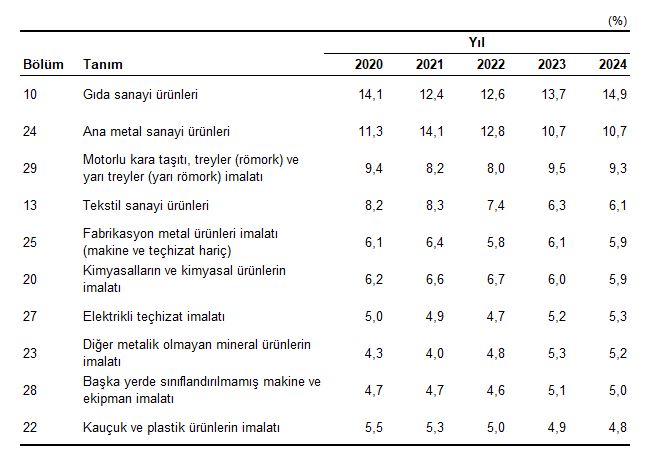 Satış değerine göre en yüksek paya sahip ilk on sanayi bölümü, 2020-2024