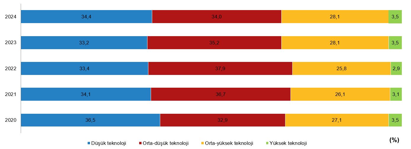 İmalat sanayinde 2024 yılında üretilen ürünler teknoloji düzeylerine göre sınıflandırıldığında, yüksek teknoloji sınıfındaki ürünlerin toplam satış değerinin %3,5'ini oluşturduğu görüldü. Düşük ve orta-düşük teknoloji gruplarının toplamı %68,4 olurken; orta-yüksek teknoloji grubunun payı %28,1 olmuştur.