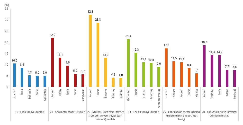 Motorlu kara taşıtı, treyler (römork) ve yarı treyler (yarı römork) imalatından yapılan satışların %82,3'ü beş ilde gerçekleşti